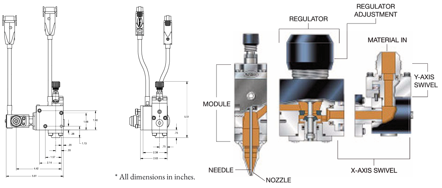 The modular design of the AG-900+S dispensing applicator allows different assembly for various gasketing, sealing and bonding applications. The applicator module can be used independently or with combinations of regulators, actuators and hose interfaces.