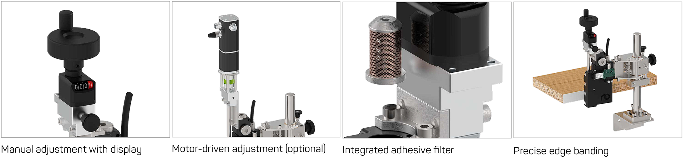 EdgePro is a coating head for edge banding of workpieces, and is mainly used in the wood industry. EVA and polyolefin hot melt adhesives, as well as PUR hot melt adhesives for thermally resistant and waterproof gluing can be processed