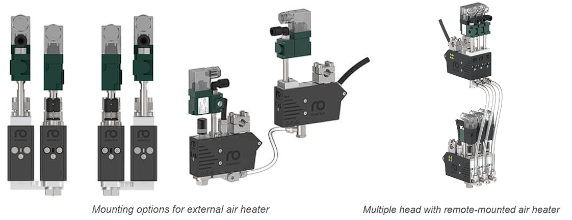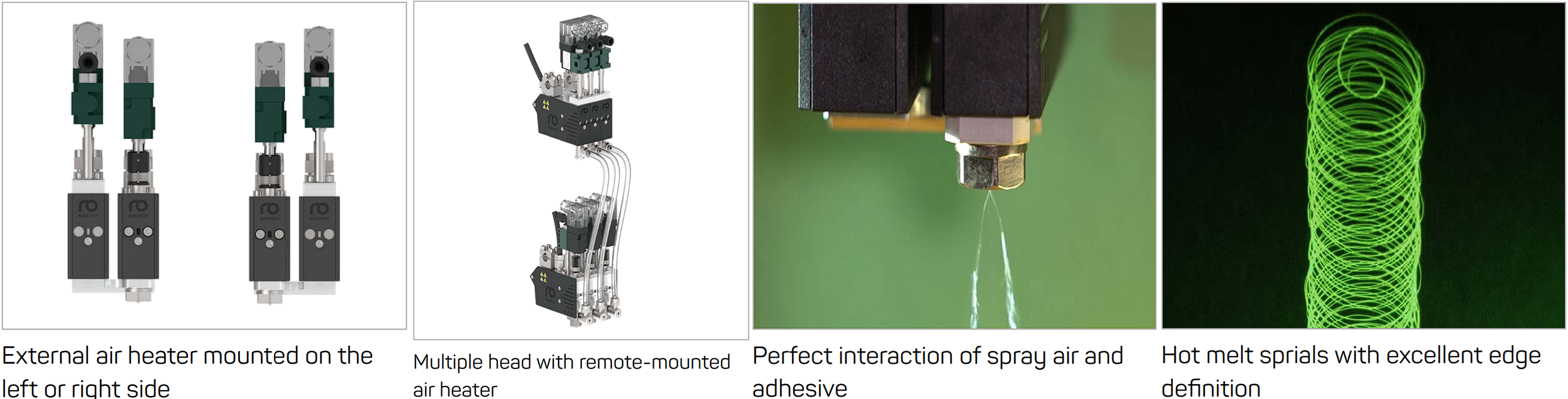 سر اسپری Aero برای چسباندن قطعات نامنظم در جاهایی که نمیتوان از سرهای پوششی استفاده کرد، مناسب است. کاربردهای معمول آن عبارتند از: پرداخت و تزئینات داخلی در صنعت خودرو یا چسباندن مواد عایق در لوازم ساختمانی. Aero از چسبهای حرارتی ترموپلاستیک یا واکنشپذیر استفاده میکند؛ چسبهای حرارتی با ویسکوزیته بالا نیز قابل استفاده هستند.