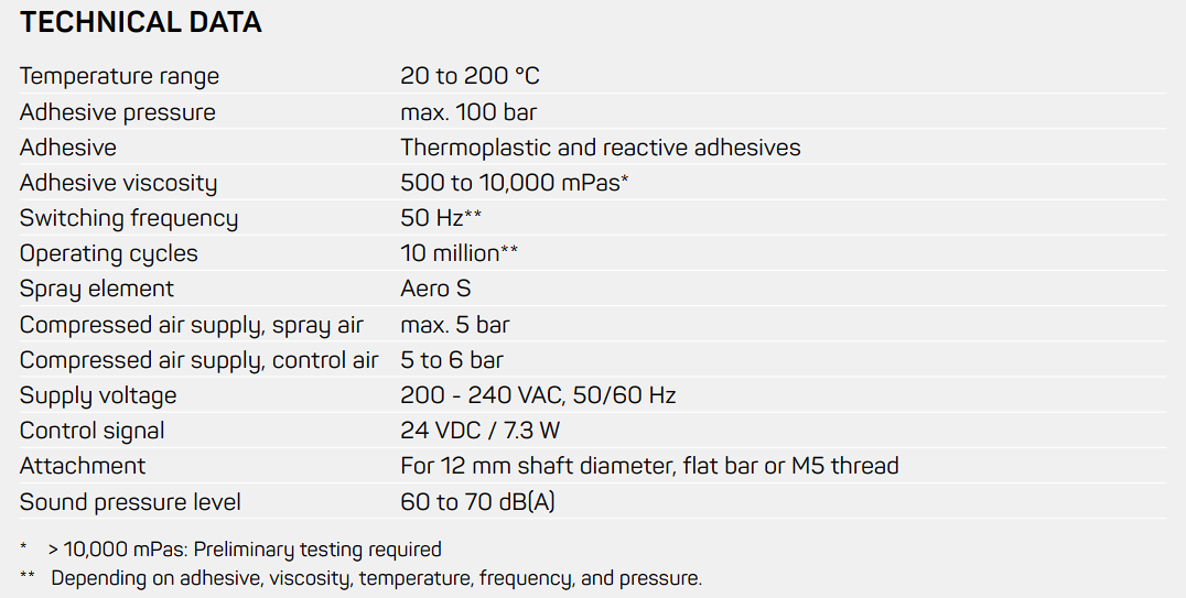 The Aero spray head is suitable for area gluing of irregular products where coating heads cannot be used. Typical applications are interior finishing and trim in the automotive industry or the gluing of insulation material in construction supplies. Aero applies thermoplastic or reactive hot melt adhesives; high-viscosity hot melt adhesives are also possible.