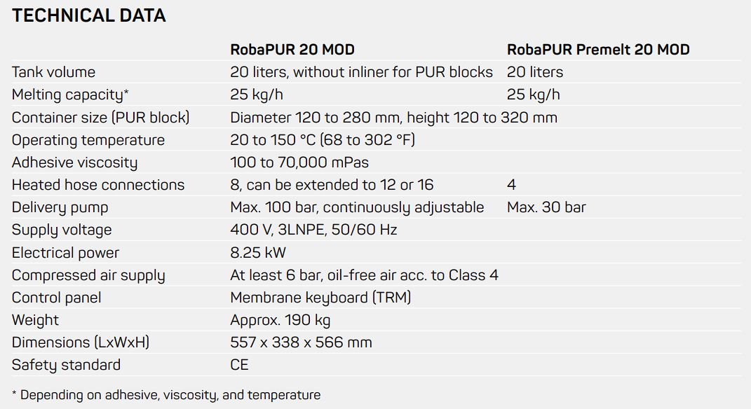The RobaPUR 20 MOD melter is suitable for melting and delivering of reactive PUR adhesives in 20 kg containers. The gentle and consumption-dependent melting protects the adhesive properties even after extended interruptions. A premelter variant is also available for filling adhesive pots.