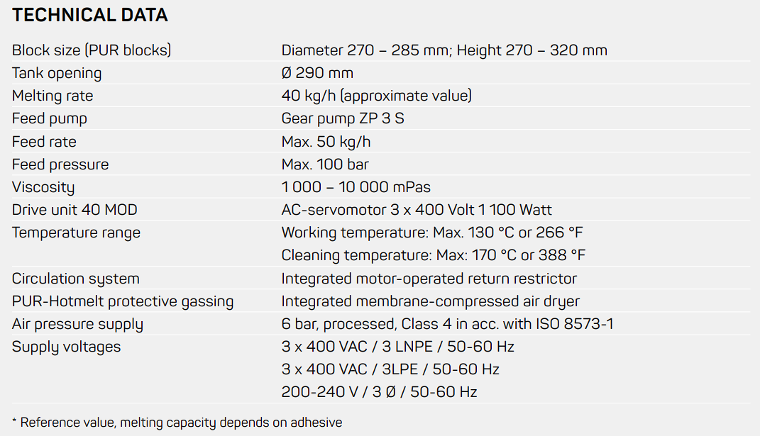 The RobaPUR 40 MOD SpineCoat adhesive melter is specially designed for the melting and pumping of reactive polyurethane hotmelt adhesives. With a tank diameter of 290 mm and the Melt-on-Demand (MOD) technology, the device is exceptional for the processing of 20-liter adhesive blocks. A gear pump is used for pumping the adhesive. This technology ensures precise quantity control.